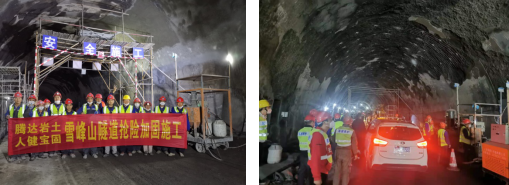 雪峰山隧道里光線較差,施工中雖使用了照明燈,但還是有所不足,場(chǎng)地因施工變得泥濘、潮濕,且隧道過長(zhǎng)、空氣不流暢,每一個(gè)從施工一線出來的隊(duì)員們不畏艱難,迎難而上,按時(shí)按質(zhì)完成任務(wù)。